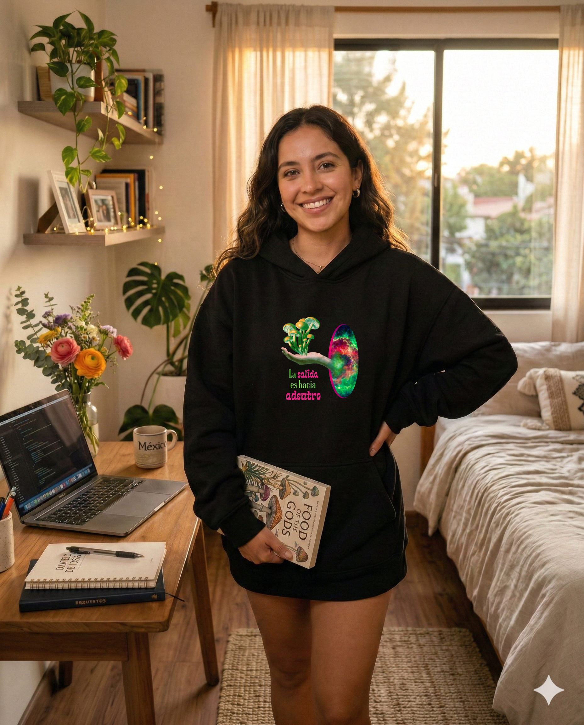 Nuestra hoodie oversize está diseñada expresamente para acompañarte mientras navegas cómodamente el universo interno, a través de experiencias con macrodosis o microdosis de Sagrado Remedio, así como también para navegar el mundo externo, cuando tienes que hacer cosas en el mundo de afuera y sentir que todo fluye de forma favorable para ti y lo que quieres manifestar.