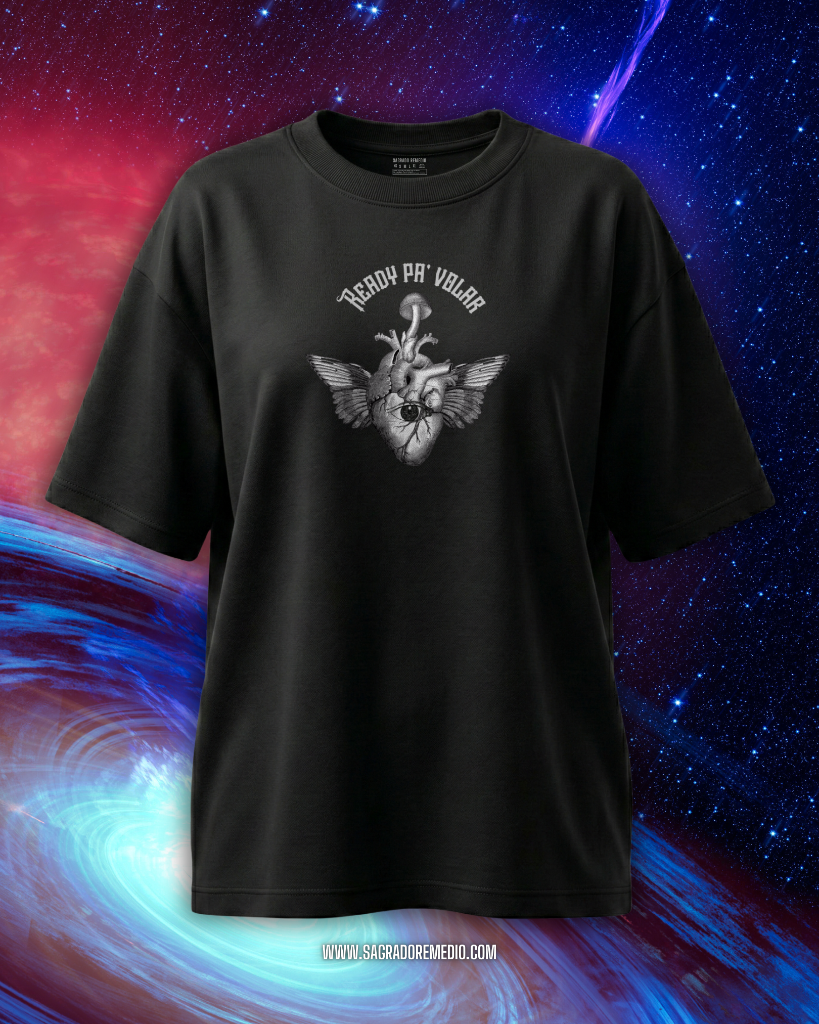La playera oversize que diseñamos en Sagrado Remedio está pensada para acompañarte en todo momento de tu día a día mientras navegas con una excepcional comodidad premium el mundo y sus desafíos, y tus propias aventuras en el interior de tu universo, a través de experiencias con macrodosis o microdosis de Sagrado Remedio.