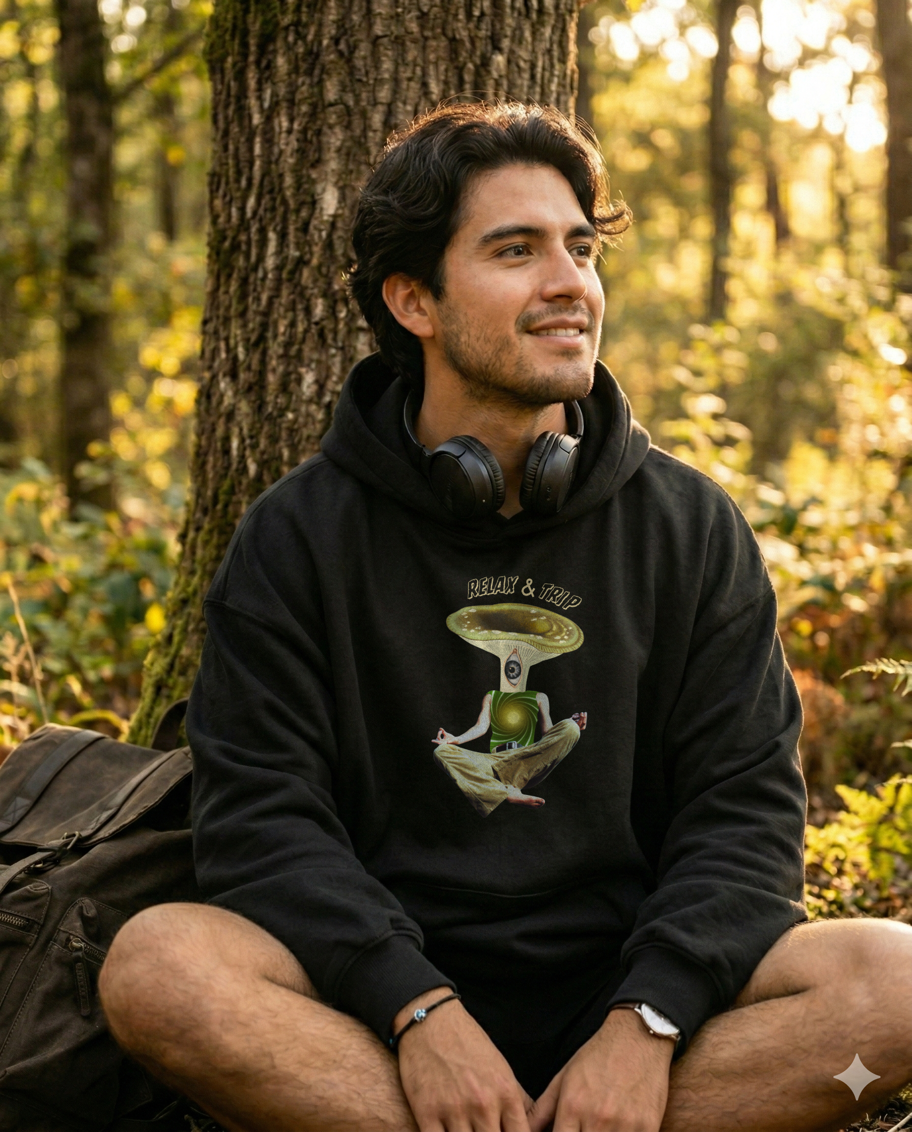 Nuestra hoodie oversize está diseñada expresamente para acompañarte mientras navegas cómodamente el universo interno, a través de experiencias con macrodosis o microdosis de Sagrado Remedio, así como también para navegar el mundo externo, cuando tienes que hacer cosas en el mundo de afuera y sentir que todo fluye de forma favorable para ti y lo que quieres manifestar.
